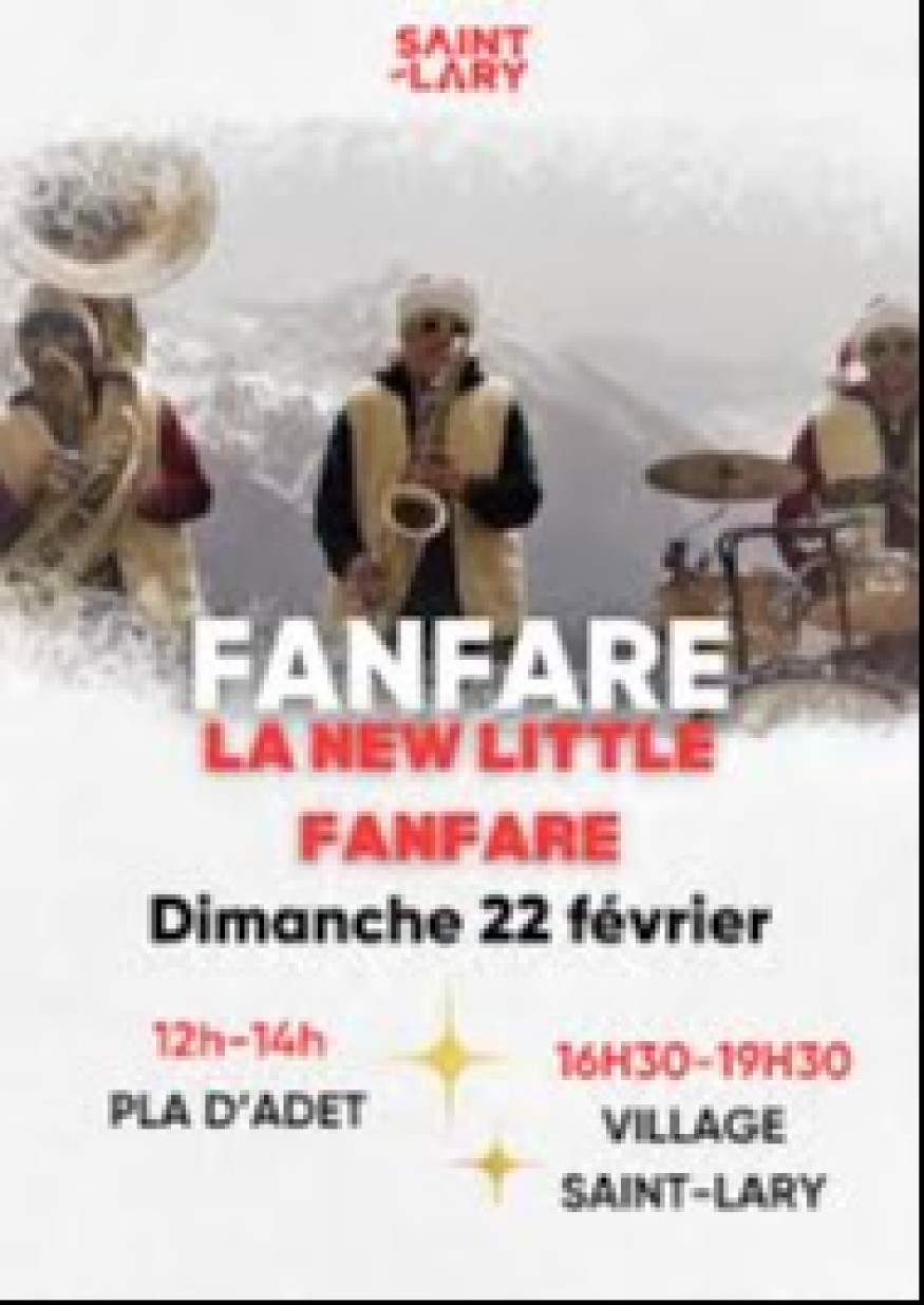 Dimanche, de 12 h à 14 h au Pla d'Adet, puis de 16 h à 19 h 30 au centre du village de Saint‑Lary‑Soulan, vous pourrez entendre le groupe « New Little Fanfare », aux sonorités groove et énergiques.