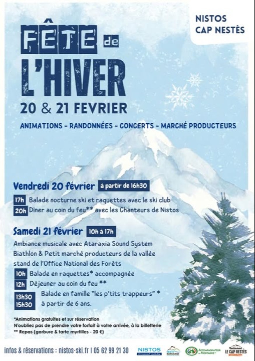 Vendredi et samedi, la fête de l’hiver s’installera à la station de Nistos. Au programme : vendredi, à partir de 16 h 30, le départ d’une balade nocturne à ski et en raquettes avec le Ski Club. À 20 h, un dîner au coin du feu avec les Chanteurs de Nistos, sur participation.