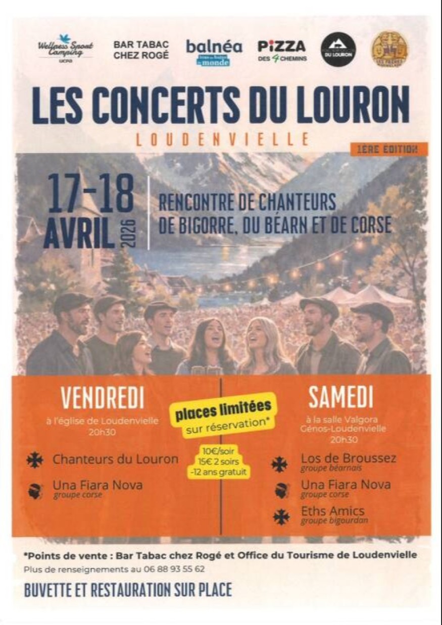 Et samedi à la salle valgora, toujours à 20h30, concerts avec le groupe bernais « los de Broussez », « Una fiora nova » et le groupe bigourdan « Eths Amics ». Les places sont limitées donc sur réservation auprès de l’office du tourisme de Loudenvielle. Une participation vous sera demandée.