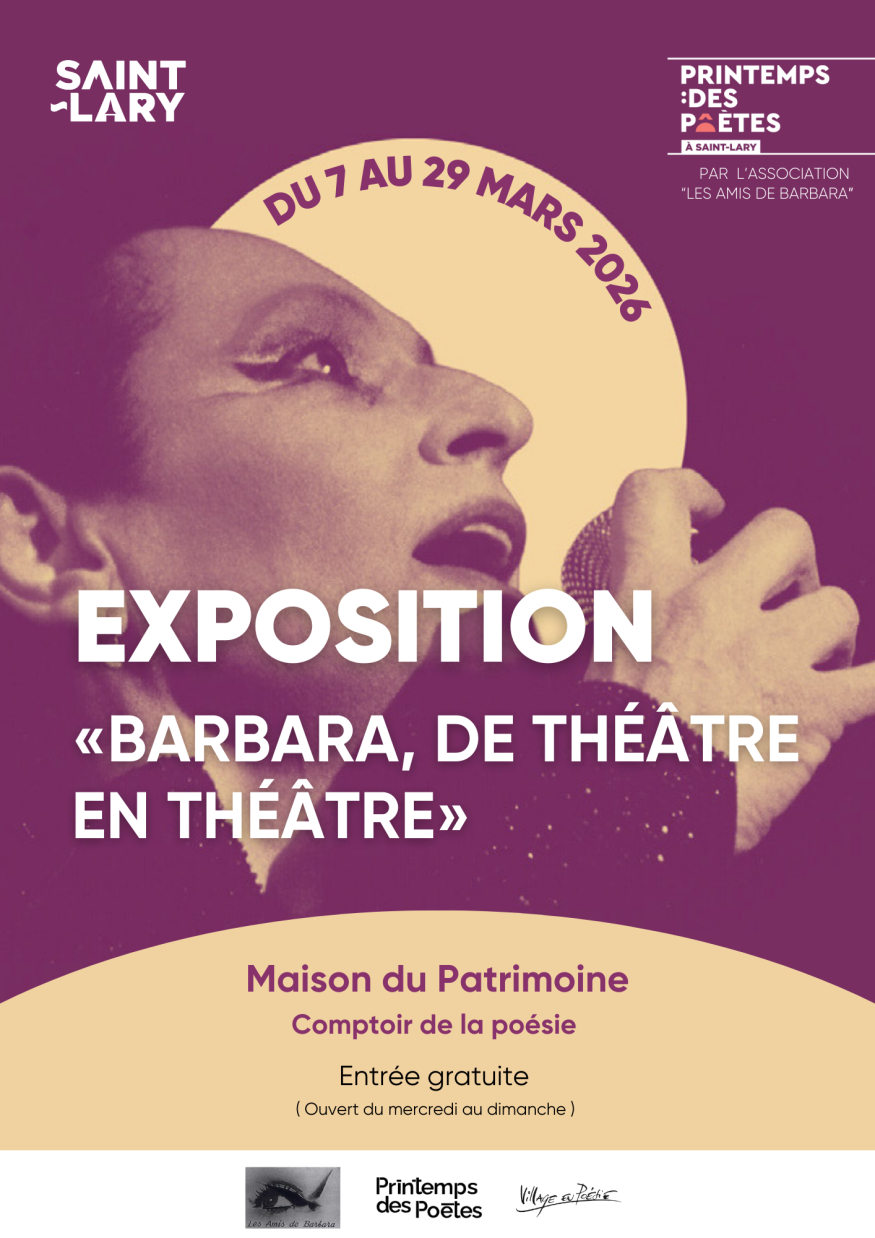 Ce mois-ci, à l’occasion de l’évènement le Printemps des poètes, du mercredi au dimanche de 10h30 à 12h et de 14h30 à 17h30, à la maison du patrimoine de St Lary Soulan, l’association les amis de Barbara, vous invitent à découvrir l’exposition « Barbara, de Théâtre en Théâtre ».