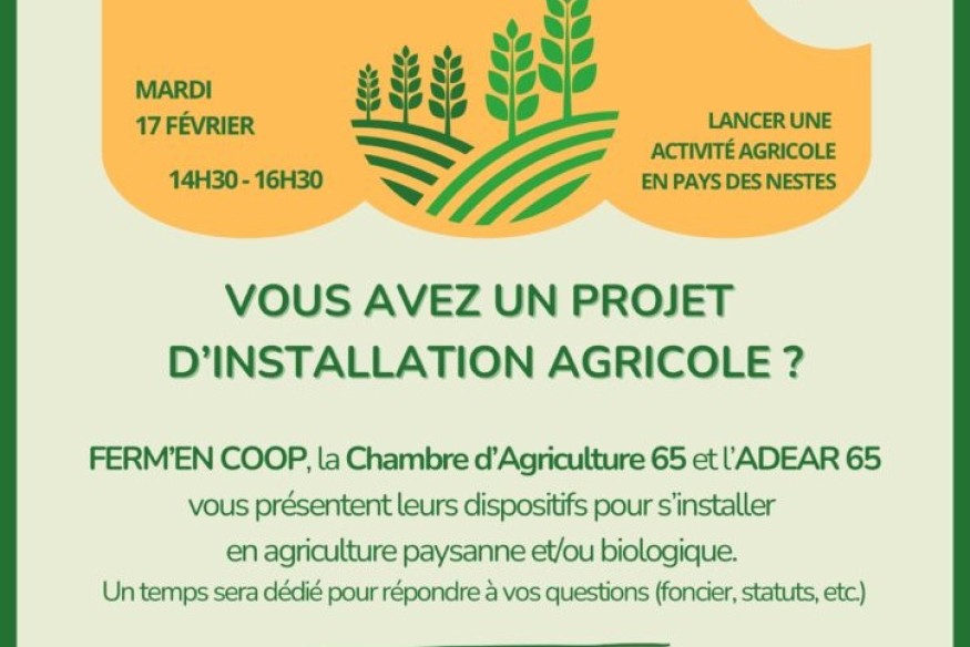 Dans le cadre du Projet Alimentaire Territorial, le Pays des Nestes organise une réunion d’information pour tous ceux qui veulent se lancer dans l’installation agricole. Ferm’en Coop, la Chambre d’agriculture 65 et l’ADEAR 65, y présenteront les différentes aides et dispositifs d’accompagnement disponibles. Ce rendez-vous propose de découvrir les structures qui peuvent vous accompagner, de comprendre les étapes pour monter un projet, le parcours pour s’installer, et d’aborder des sujets clés comme l’accès au foncier, le modèle économique, ou encore la commercialisation. Cette......