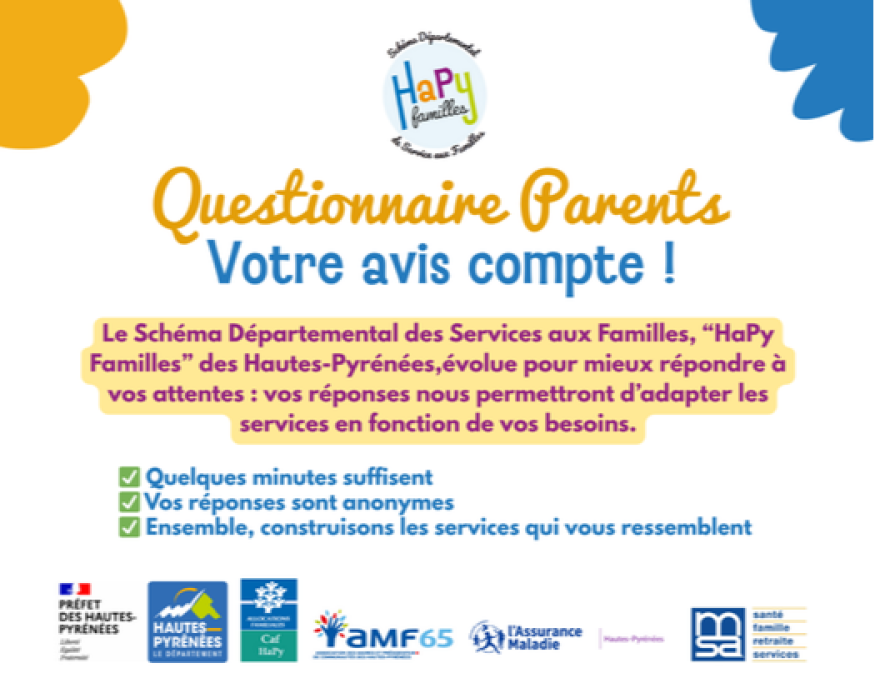 À l’occasion de l’évolution du Schéma Départemental des Services aux Familles “HaPy Familles”, le Département des Hautes-Pyrénées, la Préfecture et la Caf HaPy lancent une nouvelle consultation auprès des parents du territoire. Les réponses à ce questionnaire permettront d’adapter les services proposés aux familles en s’appuyant directement sur leurs besoins et leurs attentes. Anonyme et ouverte à tous, cette consultation est accessible en ligne jusqu’au 31 janvier 2026 sur le site du Département : hautespyrenees.fr