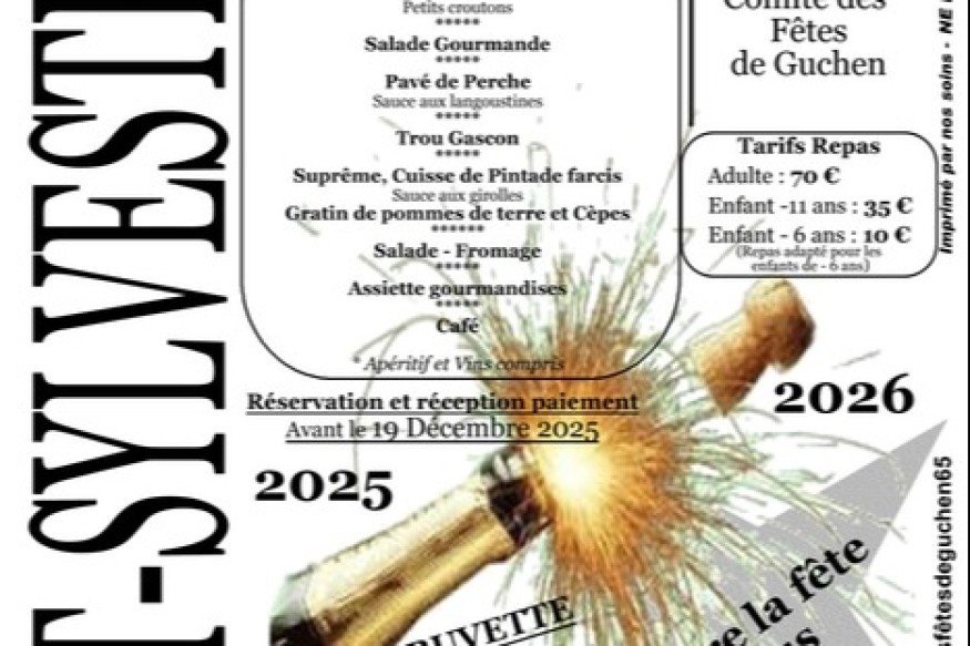 Le Comité des Fêtes de Guchen organise, le 31 décembre, une soirée de la Saint-Sylvestre avec repas traiteur et animation musicale à la salle des fêtes du village. L’animation sera assurée pa...