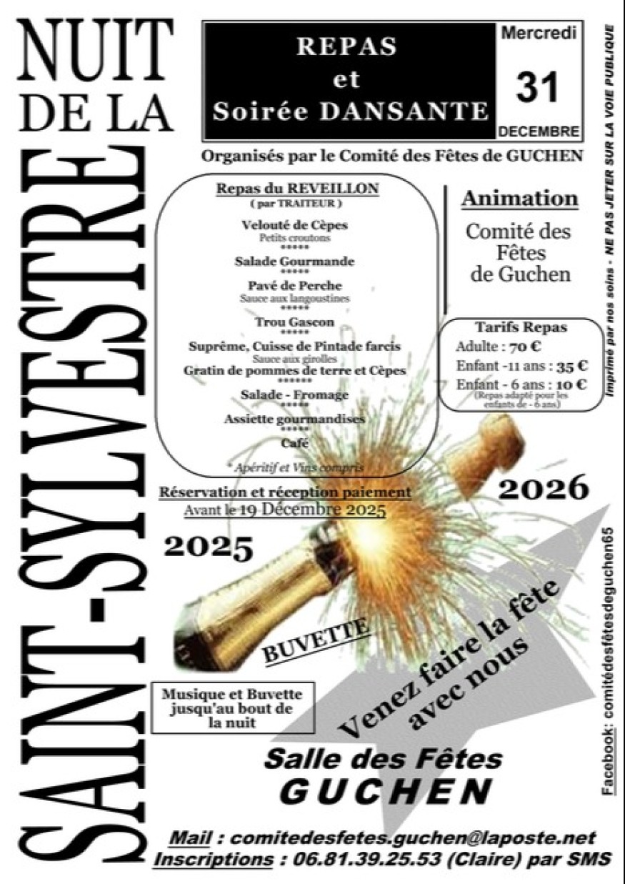 Le Comité des Fêtes de Guchen organise, le 31 décembre, une soirée de la Saint-Sylvestre avec repas traiteur et animation musicale à la salle des fêtes du village. L’animation sera assurée par le Comité des Fêtes de Guchen, et une buvette ouverte toute la nuit permettra de prolonger la fête. Les réservations, doivent être effectuées avant le 19 décembre. Pour s’inscrire contactez Clair par SMS au 06.81.39.25.53 ou par mail à l’adresse comitedesfetes.guchen@laposte.net