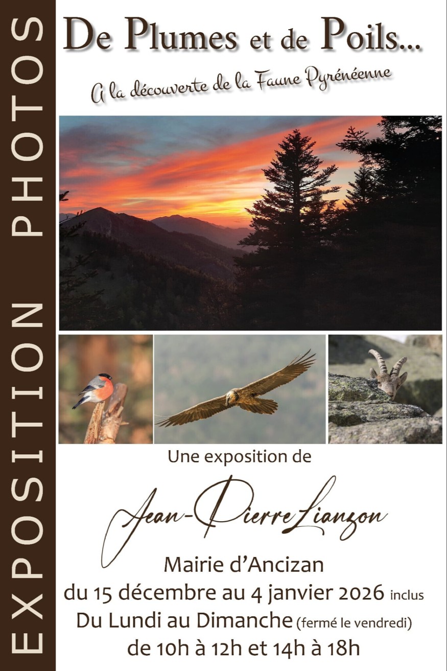 Lundi à 17h, se tiendra le vernissage de l’exposition de photos animalières de Jean-Pierre Lianzon à la mairie d’Ancizan. Cette exposition sera à découvrir jusqu’au 4 janvier de 10h à h à midi, et de 14h à 18h, tous les jours sauf le vendredi en accès libre.